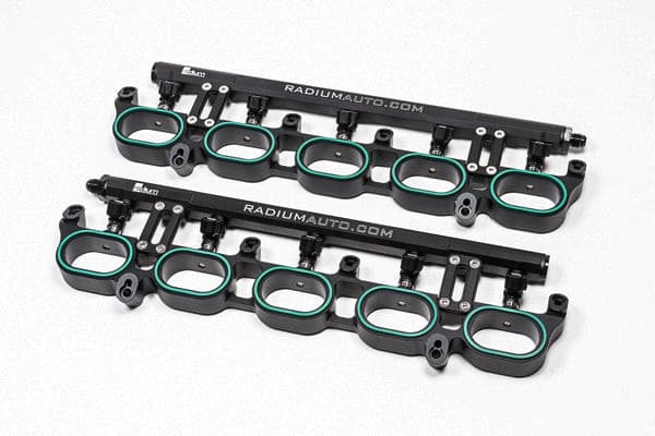 The Radium Engineering Port Injection Kit (PIK) installs between the intake manifold and the lower runners on the cylinder heads. It permits the use of port injectors for the additional fuel required for highly-modified 5.2L V10 engines. This does NOT replace the OEM direct injection system.