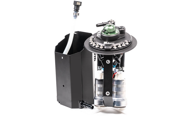 Fuel is fed out of the top plate through a single threaded port and low-profile adapter fitting. Fuel pressure is regulated inside the Radium hanger and is adjustable. The OEM fuel level sender is transferred onto the Radium hanger, so full functionality is retained.
